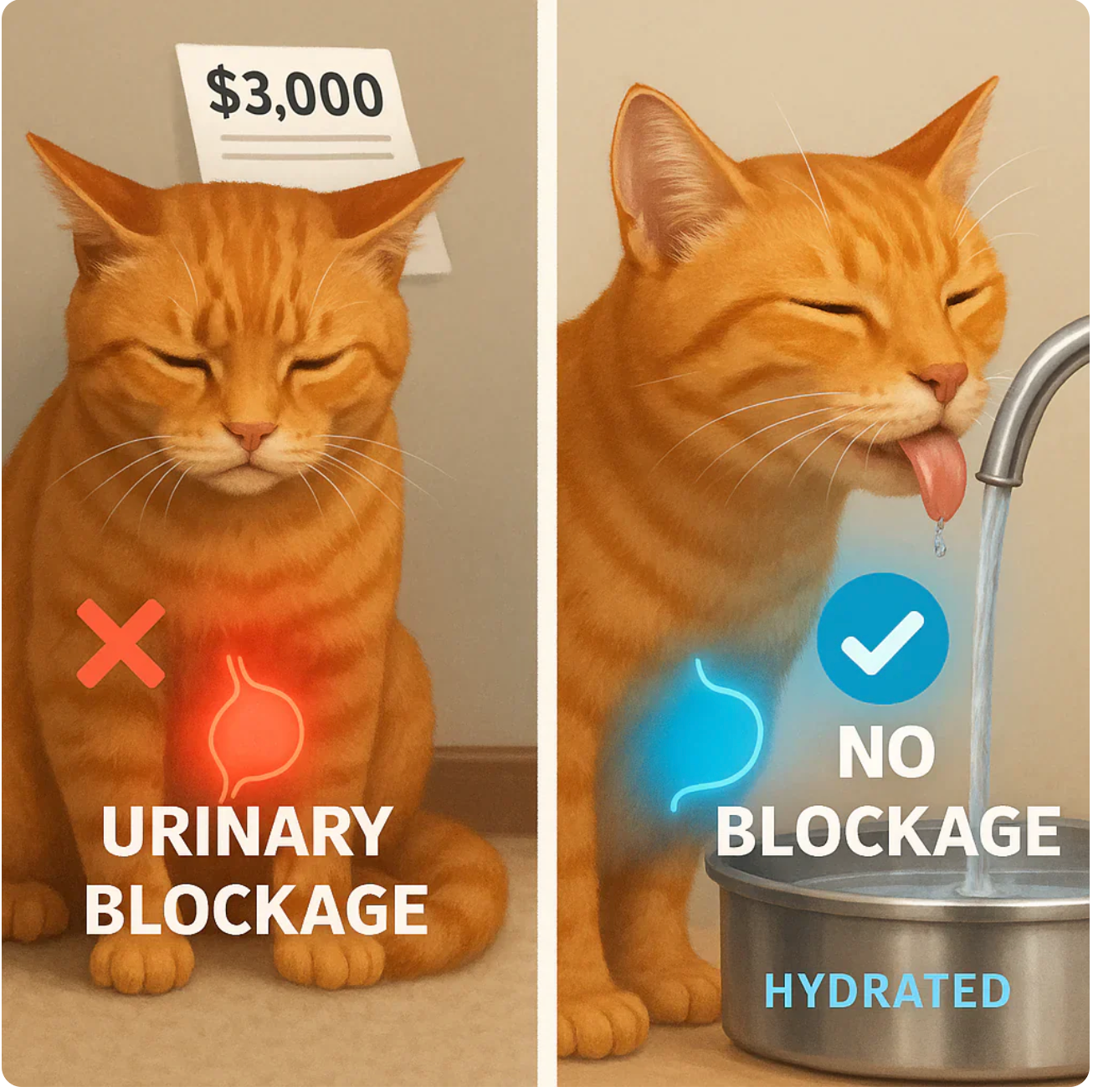 Result: your cat drinks throughout the day, stays hydrated, and avoids dangerous urinary issues.